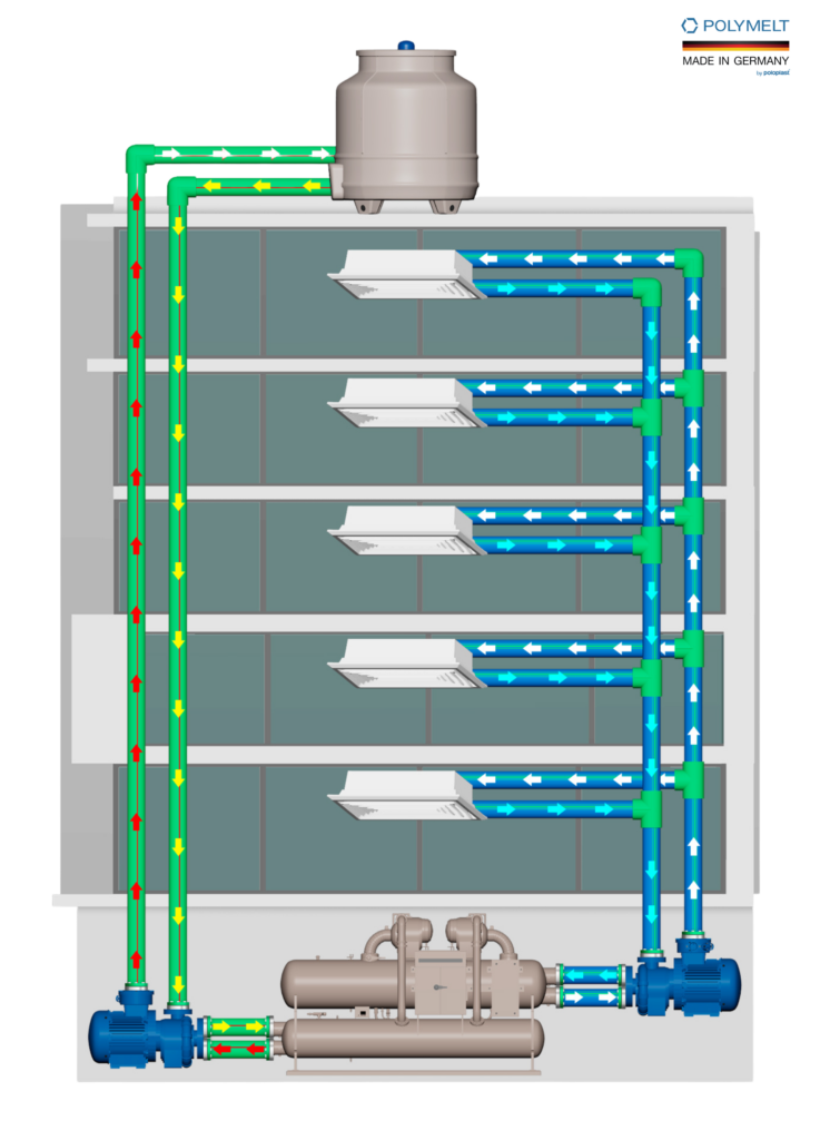 ระบบท่อสำหรับการส่งผ่านน้ำเย็นในระบบปรับอากาศ โดยน้ำเย็นจะถูกผลิตขึ้นจากเครื่องทำความเย็น (Chiller) และถูกส่งผ่านท่อไปยังเครื่องทำความเย็นภายในอาคาร เช่น คอยล์เย็น (Fan Coil Unit – FCU) หรือเครื่องทำความเย็นกลาง (Air Handling Unit – AHU) เพื่อทำให้อากาศภายในอาคารเย็นลง